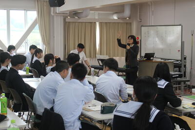 生徒会主催で、全体会をリモートで行いました。その後、未来探究コース、地域探究コース、商業科に分かれて、体験授業を行いました。