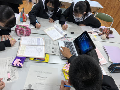 生徒たちは一生懸命タブレットを使って発表するために話し合いを進めました。