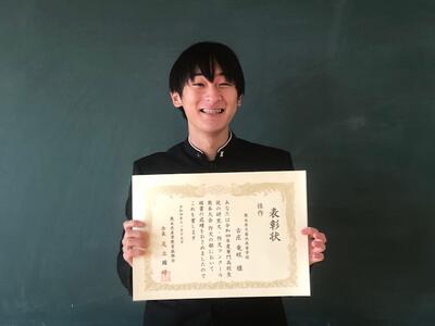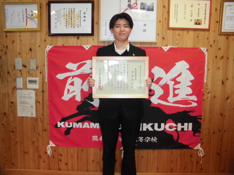 合志さんは部活動やボランティア等にも積極的に参加するとともに、勉学にも非常に熱心で現在も大学進学に向け頑張っている姿を目にします。式では蒲島知事から直接、賞状を授与されたとのことで、大変感激していました。頑張っている生徒がこのような形で表彰されることは本当に素晴らしいことだと思います。