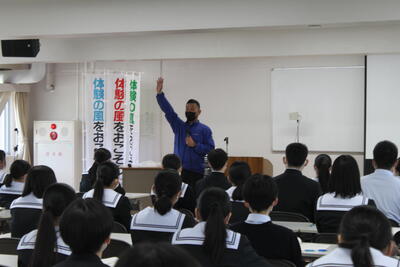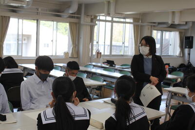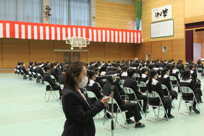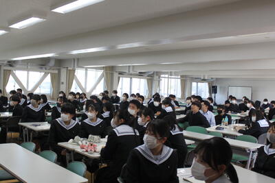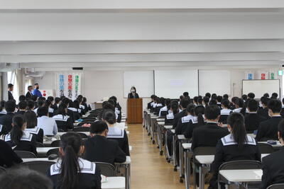 また養護助教諭が体調管理について話をされ、生徒たちは真剣な態 度で話を聞いていました。