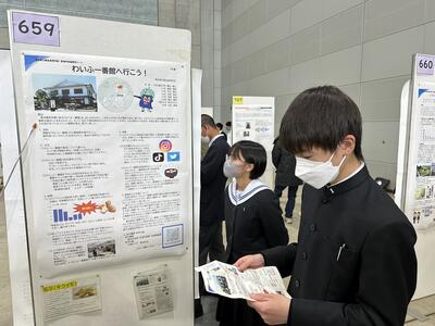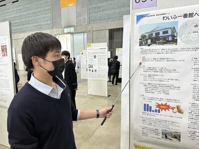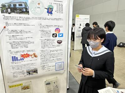 本校は、研究分野【6地域課題】にてポスター発表と、学校紹介コーナーにてドローンで撮影した学校施設案内、普通科の探究学習、商業科の菊高ジャックなどを紹介しました。