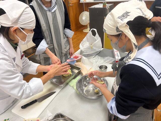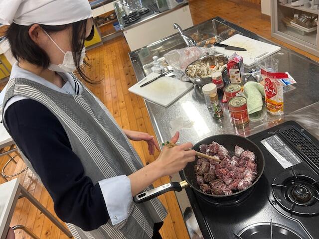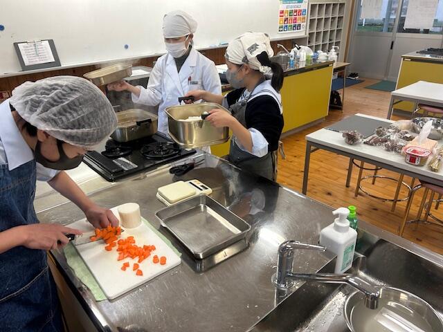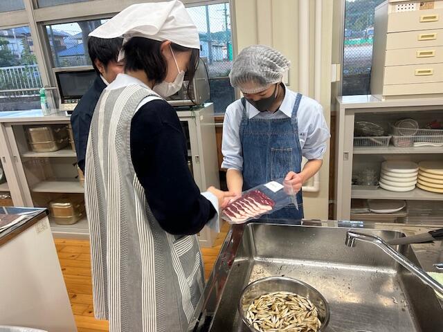 11月28日、本校の調理室で「ジビエ甲子園」に向けた試作会を行いました。生徒が考案したジビエ料理を2品(和風・洋風)試作しました。普段から料理をしている生徒が多く、家庭科の先生から助言をいただきながら手際よく試作を行うことができました。
