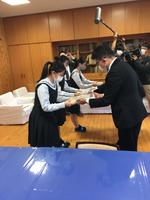 今日はその完成を記念して全校生徒へのクリアファイルの贈呈式があり、生徒を代表して生徒会長の平美月(菊池南中出身)さん、スマートアクティ部1年の村上優里(菊池南中出身)さんと恵良流月(山鹿中出身)が代表で出席しました。このクリアファイルが被害防止の啓発グッズとして役立つことを期待します。