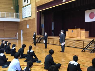 また、始業式では今回の法律改正で成年年齢が引き下げられ3年生が順次、大人の仲間入りをしていくにあたり、大人とはどういう人のことを言うか、どうあらねばならないかということについて私なりに考えた3つのことを話をしました。1つ目は「他人や周りのことを考える、思いやることのできる人」次に「自分の言動に責任が持てる人」3つ目として「自立している人」です。