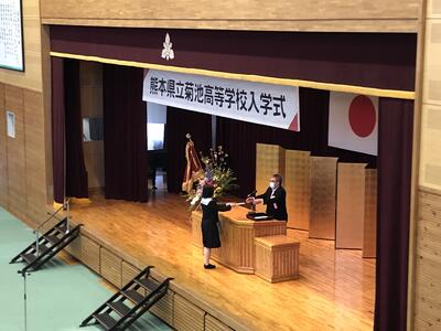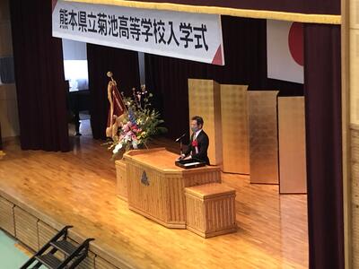 特に今年度は普通科に新たなコースの設置と商業科の学びの見直しを行い、これに合わせて菊池市からこれまで以上の大きな支援をいただきスタートする改革元年の年です。そのような意味で今日は特別に菊池市の江頭実市長がOBとして、また市長として新入生にお祝いと激励の気持ちを込めて熱く語っていただきました。このような特別な年に入学してきてくれた新入生をいかに育てるかが、これからの菊池高校の真価を問われることになると責任の重さを覚悟しています。