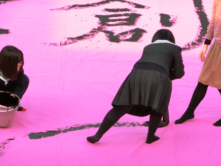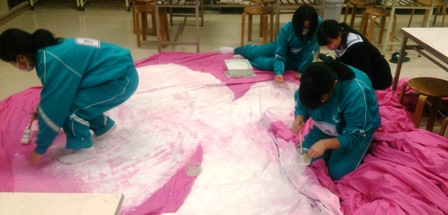 美術部の稲田さん甲斐さん、本田さん、黒木さんが大きな絵を描いています。