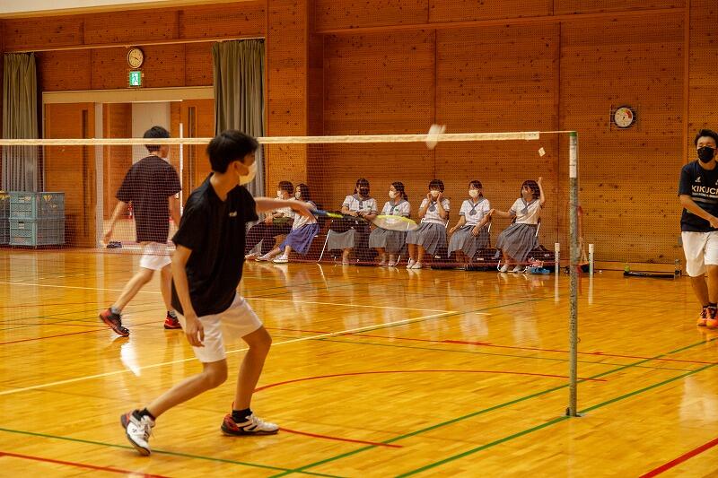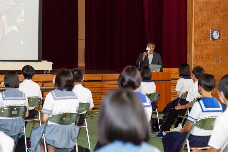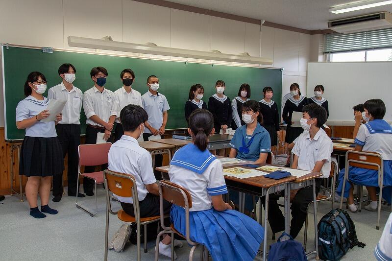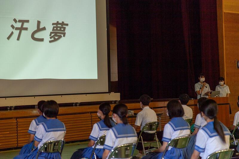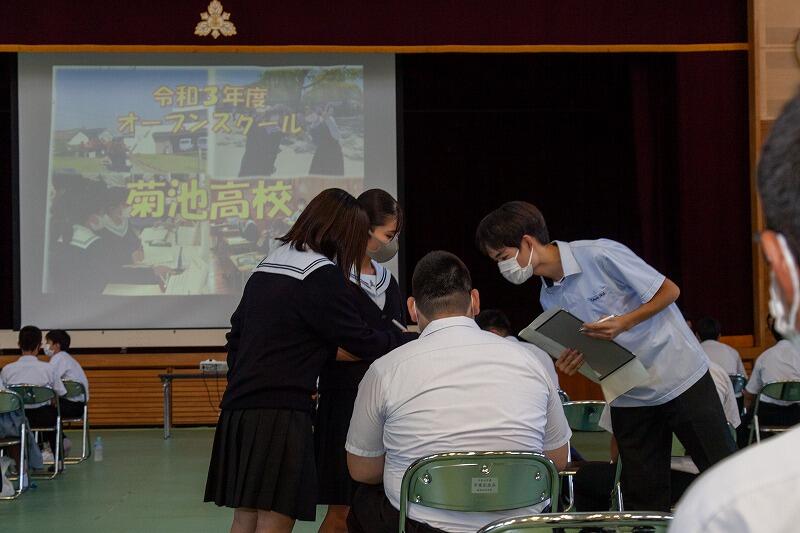 いつも中学校への説明会にも赴いてもらっている商業科主任の椎葉先生と教務主任の日元先生が来年度からの学科改編を始め、各科の紹介や本校の教育活動についてわかりやすく、熱のこもった説明をしてくれました。また、生徒会役員が学校紹介の動画とスライドを作成し、2年生の柴田紗希さんと1年生の高木愛美さんがクイズなども交え、生徒の視点で親しみやすく菊池高校を紹介してくれました。