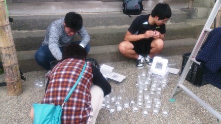 1年3組の村上 豪児くんと2年5組の萩尾 将太くんが担当したのは、竹灯りのろうそく設置です。400個のろうそくを耐熱コップにセットして、火をつけ竹灯籠の中に一つずつ入れていきます。 全部入れ終わるのに2時間弱かかりました。