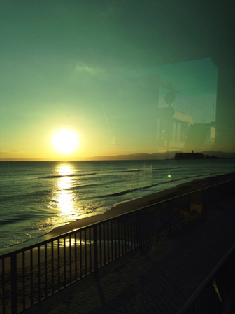 バスの中からきれいな夕日と江ノ島が見えます。