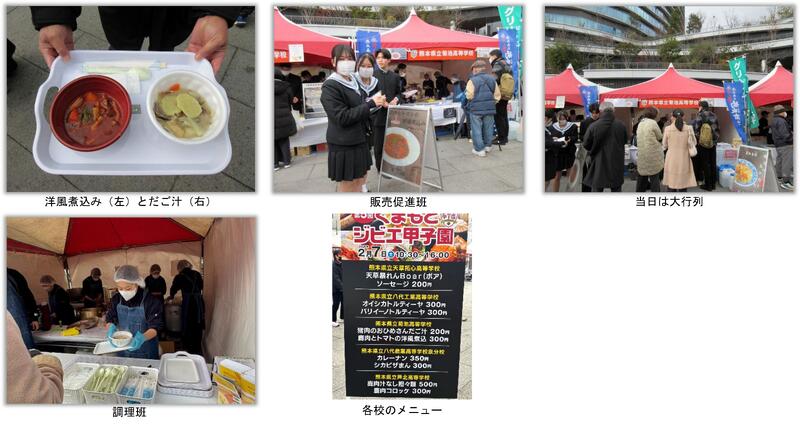 2月7日、熊本市花畑広場にて「第5回くまもとジビエ甲子園」が開催され、本校まちづくり部の生徒を中心とした有志生徒7名が初参戦しました。本大会は、近年問題となっている鳥獣被害への理解を深め、ジビエの利活用を推進することを目的に、熊本県むらづくり課主催のもと、県内の高校が連携して行われるイベントです。