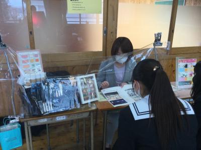 例年は、午前中は大学訪問するそうですが、今年度は学校での実施となりました。午後からは、学校別分科会と言うことで、各教室にブースを設け、様々な学校から学校説明に来ていただきました。