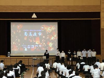 菊高ブログにも掲載されているように本日は生徒会の立会演説会が行われました。生徒会長、2年副会長、1年副会長各1名の定数に対し、会長に1名、2年副会長2名、1年副会長1名の立候補があり、4名の立候補者の演説と各応援者の応援演説がありました。