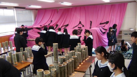 1年生と2年生が一人1本制作した竹灯籠を教室に展示しました。