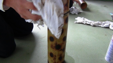 前回は「油抜き」した竹にデザインした紙を貼り付けるところまででした。