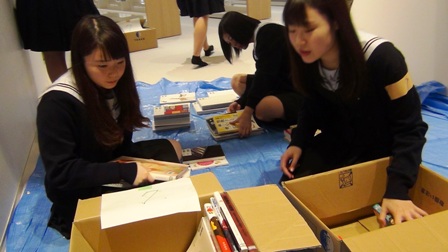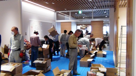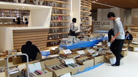 8つの班に分かれて、本を運びます。運ばれた本をさらに分類していきます。