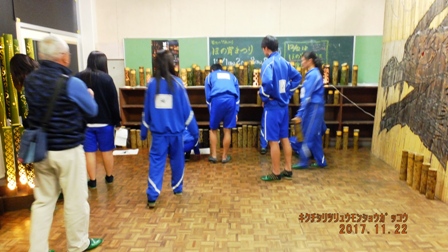 テーマを決めて製作した60本を順番に並べます。菊池高校の校歌から「風」「木」「川」