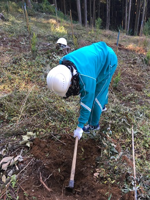 本校の育友会が管理する山林で、1年生が山林の管理や植樹などの体験学習を行いました。自然環境の保全などの学習に加え、クラス対抗の丸太切り大会などのイベントも実施し充実した体験学習を行いました。