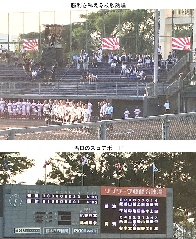 当日は、菊高生や教職員、保護者、OBの皆さんが球場に駆けつけ、声を枯らしながら熱い応援を送りました。試合終了後には、スタンドと選手が一体となって校歌を熱唱し、感動の瞬間を共有しました。