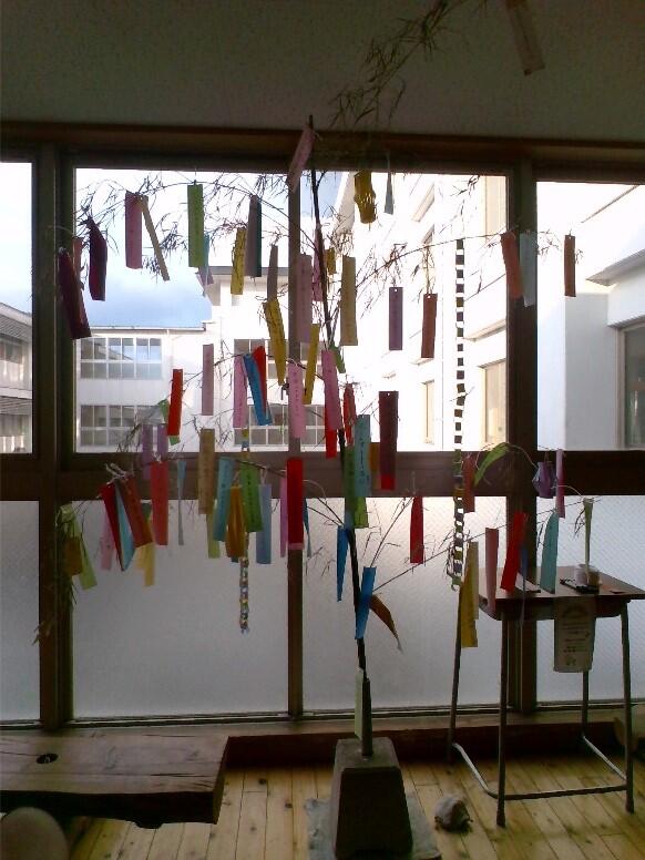 7月1日から7日までの1週間、図書館の入り口前にまちづくり部が考案した七夕の笹飾りを設置しました。期間中は多くの生徒が短冊に願い事を書きに来てくれました。最終日には写真のように笹いっぱいにカラフルの短冊が飾られ、華やかな空間になっていました