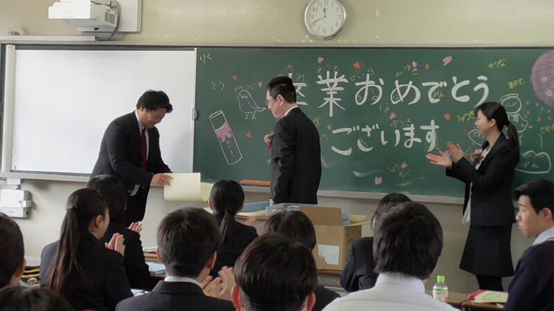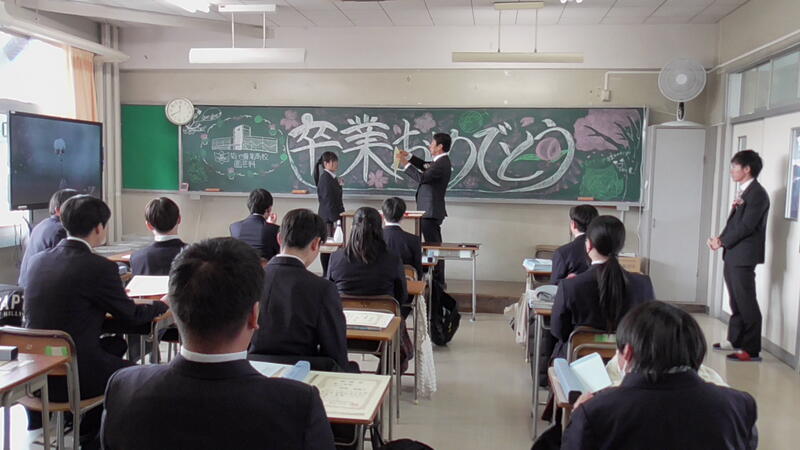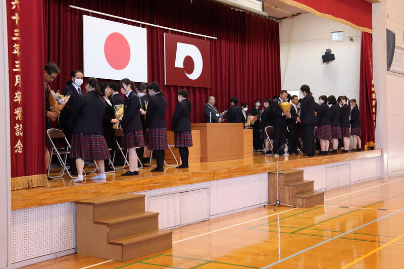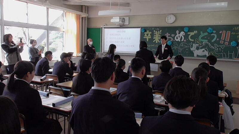 本日は卒業証書授与式が行われました。前日の雨も上がり、登校する卒業生の足取りはとても軽やかでした。晴れやかな表情で臨んだ式ではたくさんのお祝いの言葉をいただき、卒業生も在校生も深く聞き入っていました。退場の際にはクラスごとに並んで感謝を述べ、大きな拍手に包まれながら会場を後にしていました。式後はそれぞれのクラスで卒業証書や表彰状が渡され、受け取った生徒は一人ずつ思いを話したり進路を伝えたりしました。担任、副担任の先生だけでなく学科の先生も加えての賑やかなロングホームルームとなりました。