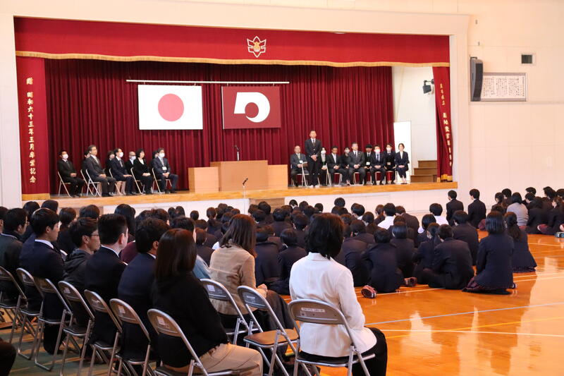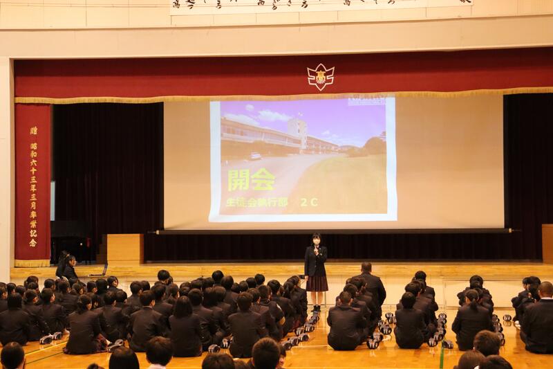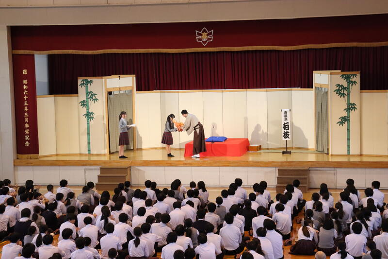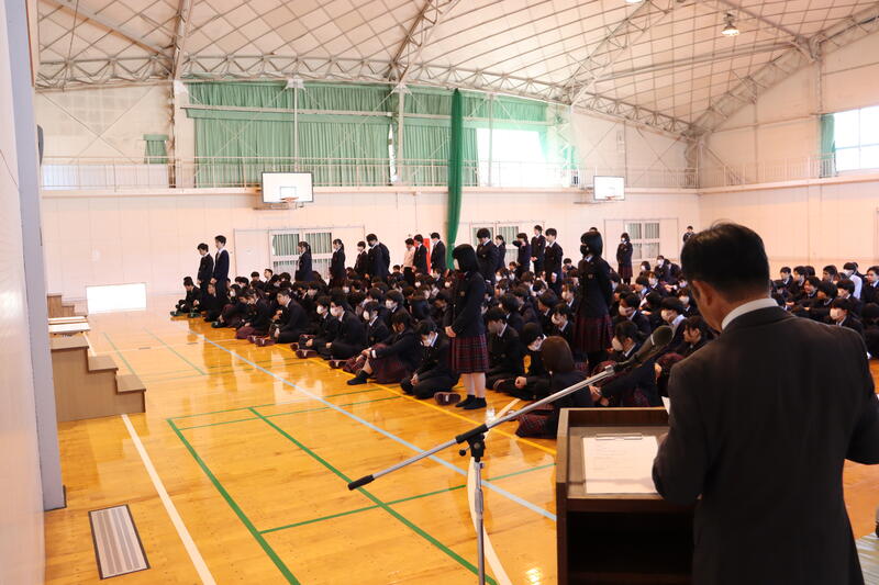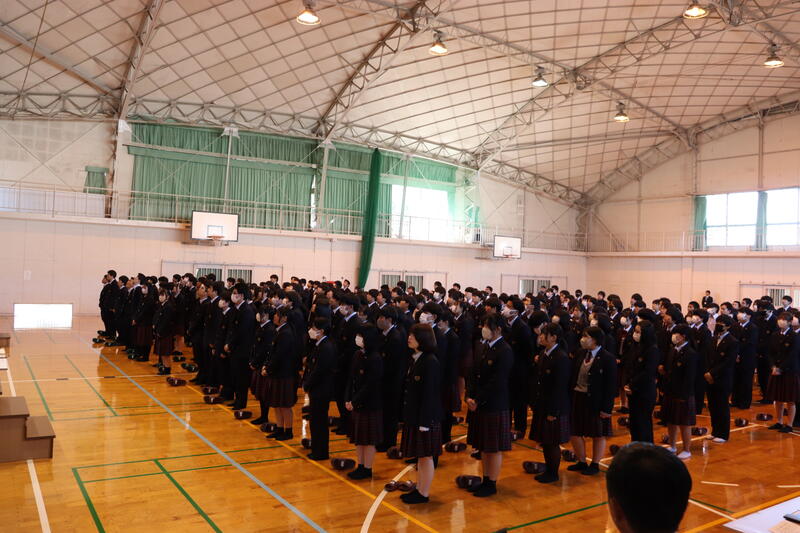 本日は令和5年度修了式が行われました。修了式前には表彰式があり、大会等を始めとして皆勤賞や成績優秀賞で多くの生徒が表彰されました。継続した努力が実り、大きな拍手で称えられていました。修了式では校長先生より、行事における生徒それぞれの主体的な関わりがとてもすばらしかったということ、がんばりの中で身につけたものを糧に、次の学年への自覚を持ってさらに行動していってほしいということが伝えられました。そして意欲的に前向きにチャンスをつかみ、何事にもチャレンジしていってほしいと励ましの言葉がかけられました。その後の生徒指導部や進路指導部の話でも、与えられた今という貴重な時間を大切に、自分の頭で考え自ら行動を起こすこと、将来を見すえ準備を怠らないことが大切であると話されました。新たな学年へ向けて、様々なことを考え積極的に行動してほしいと思います。ホームルームを終えると生徒たちは笑顔で元気に帰っていきました。