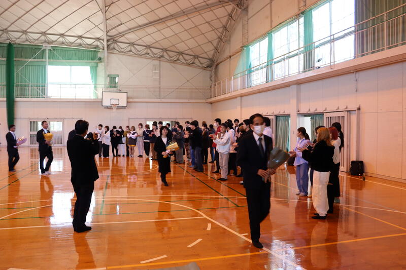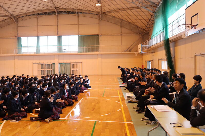 本日は令和5年度転・退任式でした。校長先生、教頭先生を始めとして22名の先生方が本校を去ることとなり、多くの在校生・卒業生が集まりました。先生方はそれぞれ思い出を話されたり、生徒たちへのエールを送られたりしました。命を大切に、周囲との関わりを大事にしながら高校時代を意欲的に過ごし、幸せになっていってほしいと様々な先生から熱い思いが語られました。会場を後にする先生方を盛大な拍手で見送る生徒たちは、寂しそうな顔をしていました。ホームルーム後、転・退任される先生方を訪ねる生徒たちの姿が各所で見られました。一期一会、出会えたことに感謝する一日でした。