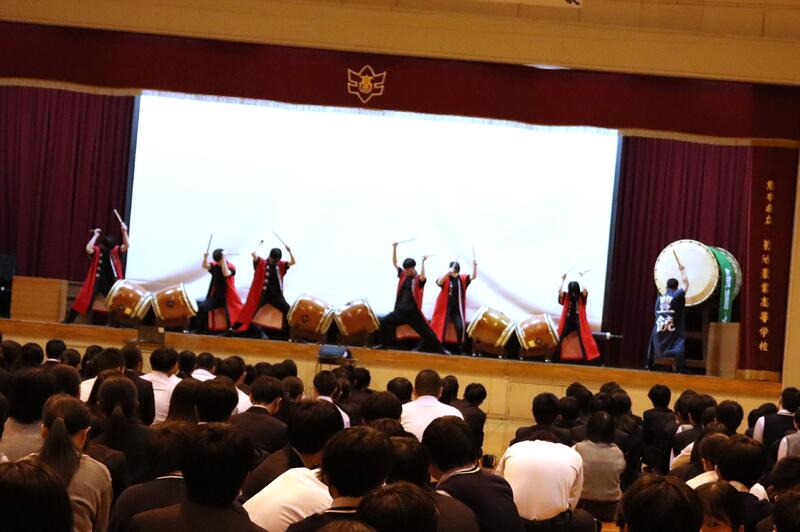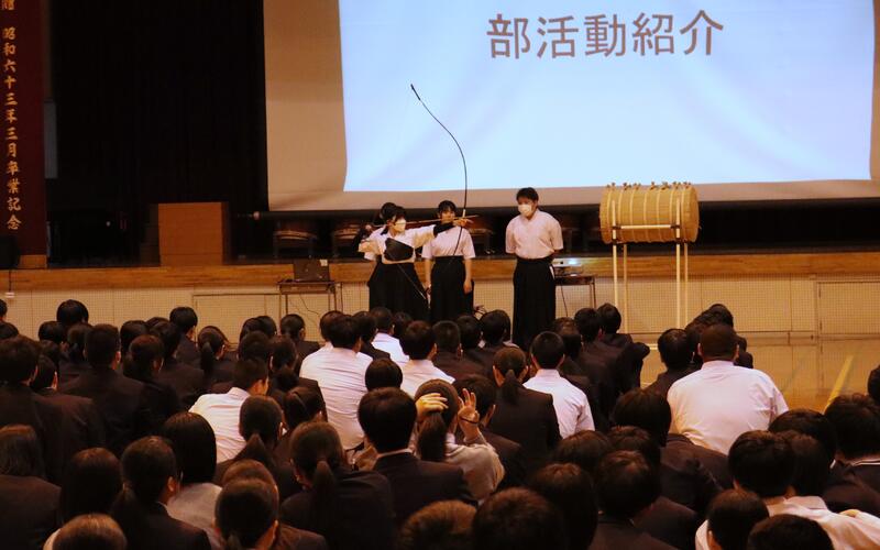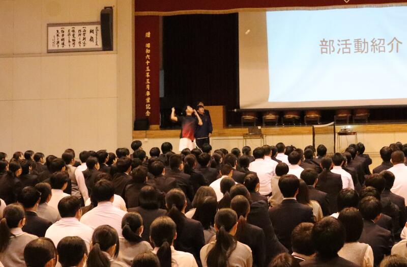 新入生も少しずつ学校に慣れてきた今日、部活動紹介がありました。各部、スライドを使った紹介や実演での紹介など工夫が凝らされ、新入生だけでなく皆が楽しめる内容でした。とりを飾った太鼓部の演奏では、会場全体が静まり返り誰もが聴き入っていました。今日の放課後から部活動見学等も始まります。盛り上がっていきましょう。