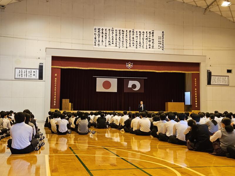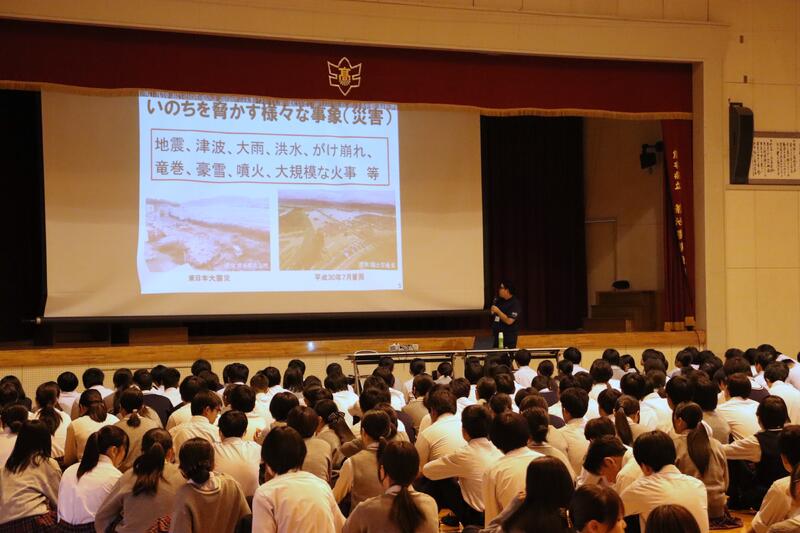 講師に防衛相 自衛隊熊本地方協力本部長一等陸佐 矢野 秀樹 様 を迎え現地災害時での活動記録を中心に講和いただきました。テーマは「将来の災害にいかに備えるか」でした。生徒も真剣に講和を聞き、たくさんの質問をおこなっていました。