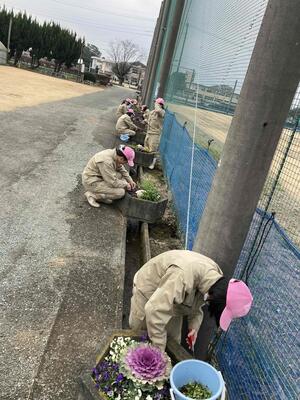 10月にポットに移植したカーネーションの苗を1,2年生で5号鉢に鉢上げをおこないました。