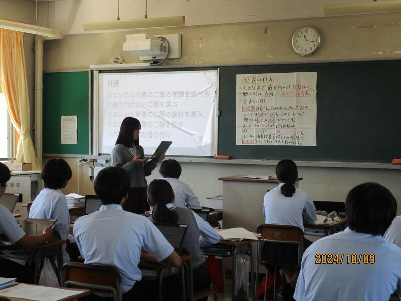ドレス製作、様々な調理実習の作品などの説明があり、1・2年生は一生懸命話を
