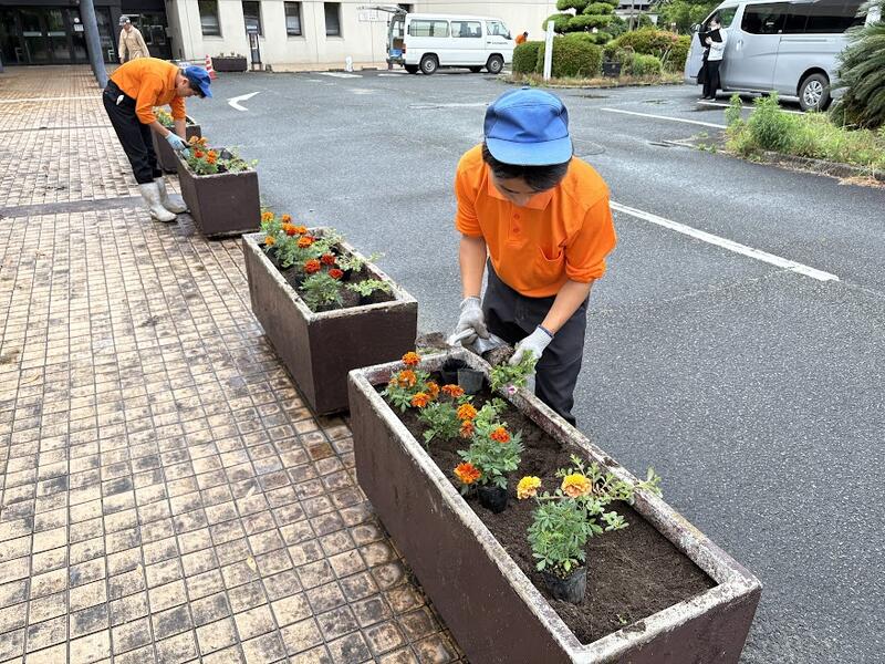 毎年花苗を購入していただいています。前回植えた「ビオラ」を植え替え、「マリーゴールド」「ポーチュラカ」を植えていきました。普段栽培している草花がどのように活用されているのかを知る良い機会になりました。園芸科の草花はたくさんの施設や学校に購入していただいています。生徒の母校や保育園、普段生活をする場所、通学路など周りにたくさんあることが嬉しいですね花丸