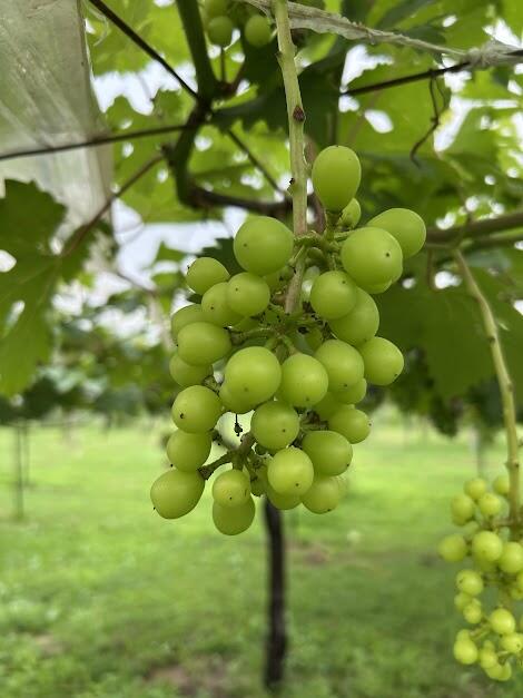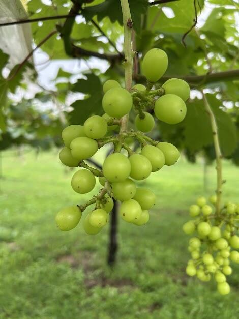小さな実をつけているマスカットベリーA1ツ星無核のために1回目のホルモン(ジベレリン)処理を行いました。植物成長調整物質のジベレリンを一房ずつ漬けていくことで、ブドウの種ありを種子なしにできると考えるとすごいですよね。お客様が食べやすいように種なしにする技術を使ってコツコツと頑張っています。多くのお客様が楽しみにされているので、やる気も出ることでしょうキラキラ