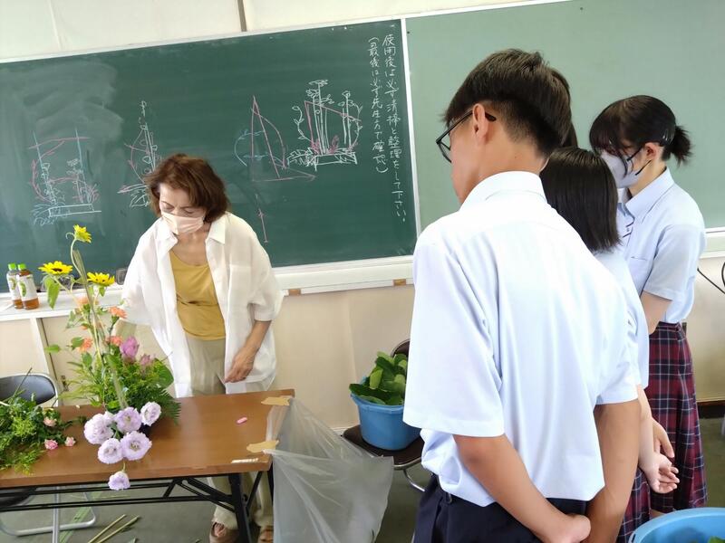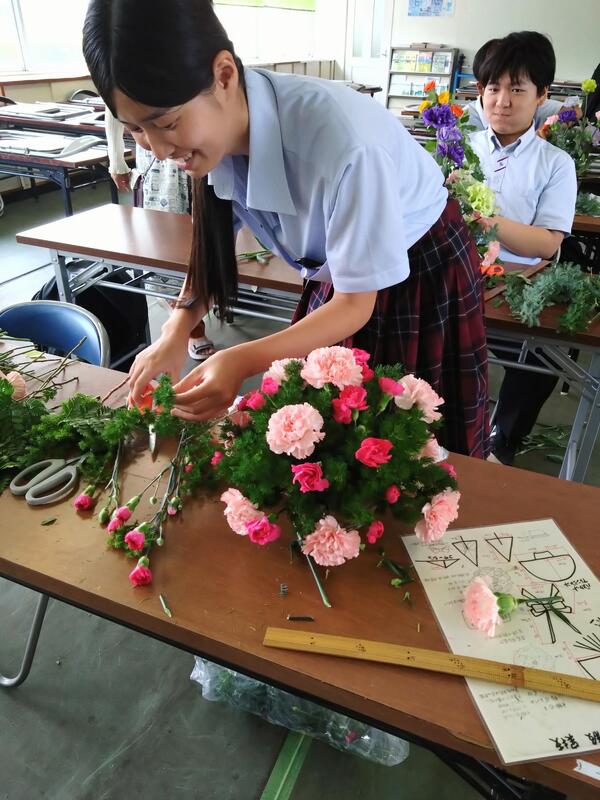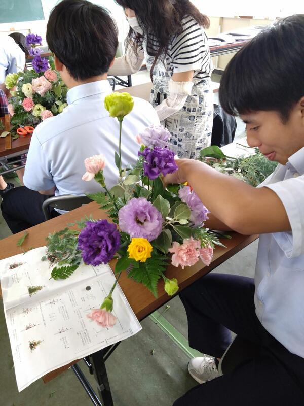 2年生もフラワーアレンジメント制作をしました。スポンジに挿すアレンジメントが初めての生徒もいましたが、先生のアドバイスを受けながら上手にできています。