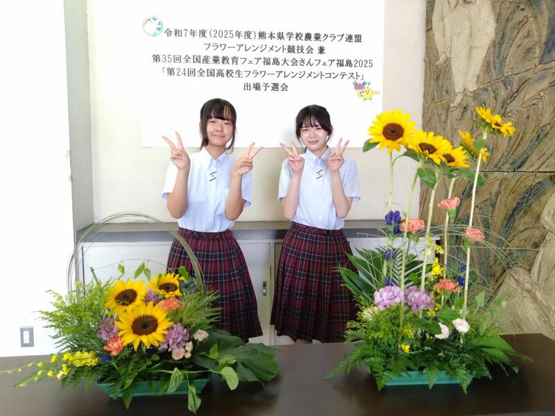 熊本農業高校で実施された農業クラブの大会であるフラワーアレンジメント競技会に出場してきました。今年は2年生の花が大好きな2人です。決まった花材で配置やデザインを考えて、練習した作品を思い出しながら60分でテーマ書きや片付けも含めて作成します。手際よく、時間内に完成させることができました。よくがんばりました。