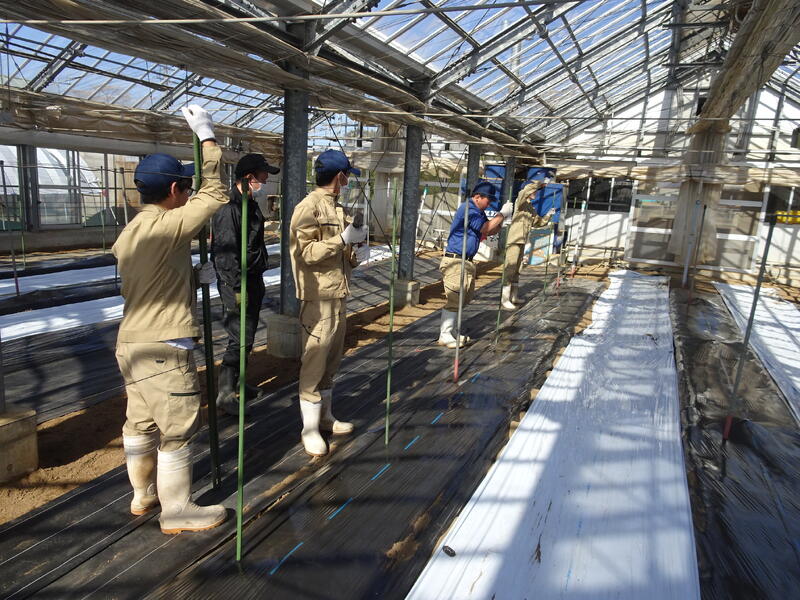 班に分かれて、実習を行いました。トマトの支柱立て班メロン苗のためのポットに土詰め班、花苗のためのポットに土詰め+花鉢に置き肥班、です。