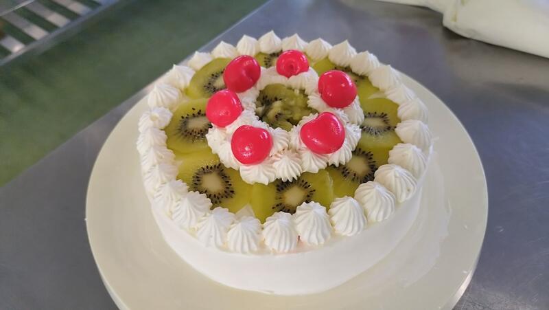 先週作った生地に生クリームとキウイ、チェリーでデコレーションをしていきます