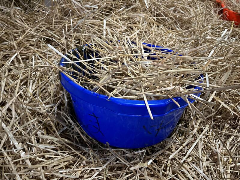 共進会では牛が綺麗な姿でショウリンクを歩くために工夫します。その一つが毛刈り。牛がさらに輝きます。毛刈りをするためには牛の体を洗わなければなりません。そして、洗ったあとは汚すわけにはいきません。そこで活躍するのがこの糞とりバケツ。牛の糞を落とさないようキャッチするのです。