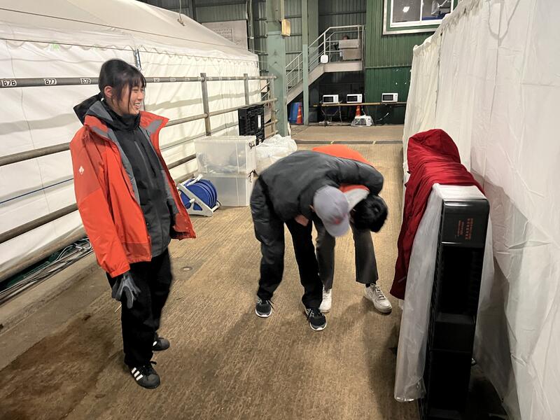 お土産を買ったりした後、一団は室蘭港に着きました。バスを降りたらびっくりの強風。気温も下がり、寒いです。搾乳、エサやり、水やりなど、飼育管理を行いました。