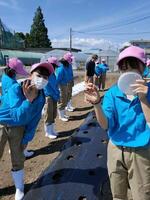 先日2年生で畝立て、マルチ張りをした場所にトウモロコシを播種(種まき)をしました。