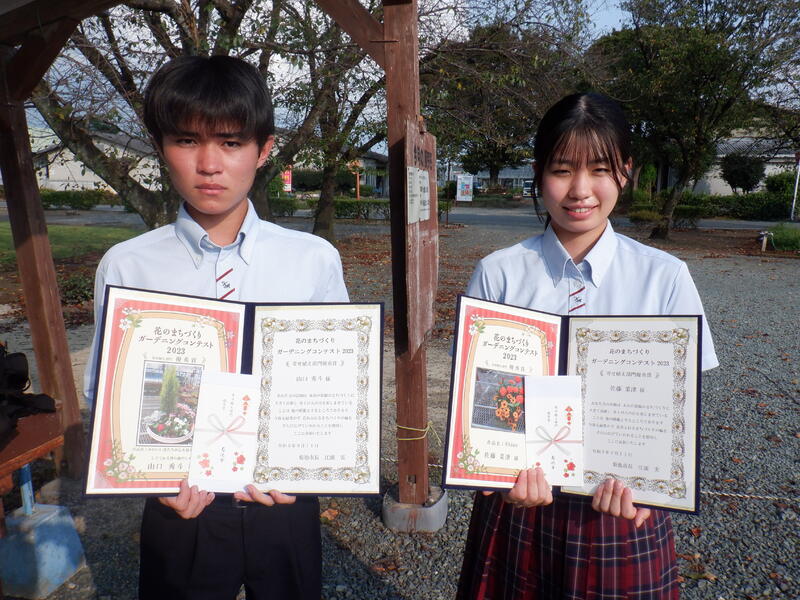 課題研究「草花活用」で作成した寄せ植えを菊池市の花のまちづくりガーデニングコンテストに応募しました。すると、寄せ植え部門「優秀賞」を2作品いただきました