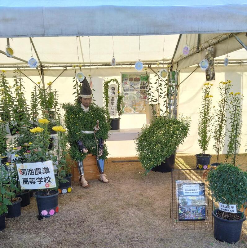毎年菊まつり推進委員会の方々にご指導いただいている菊人形と菊鉢栽培。今年度は菊人形、懸崖菊、輪菊、スプレー菊など様々な種類を栽培しました。課題研究草花活用の7名の生徒・職員で日々の管理の成果で、とてもいい状態で出品することができました。今年は管理の場所を屋外からガラス温室の日当たりをよく、西日が当たりにくい、真夏は遮光ネットで葉焼けを防ぐ、農薬散布の回数増加、液肥かん水の回数増加のプロジェクトにより、今の状態にできたと思います。残念ながら短日処理はできませんでしたので早咲きにすることはできませんでした。例年開花はまつり後半になりますが、ぜひ菊池市ふるさと創生市民広場の菊まつりではご覧ください