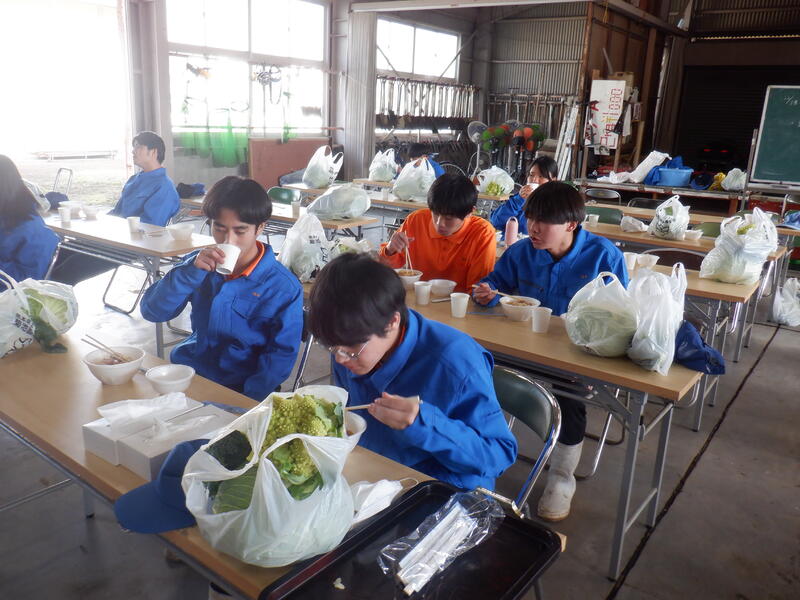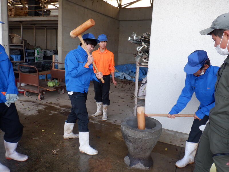 園芸科の農業と環境では冬野菜を栽培しています。そのハクサイやダイコンを使った鍋作りと田植えをした農業科のお米でご飯を炊き、火起こしからの餅つきをしました。