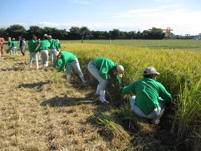 農業科1年生が6月に手植えで田植えを行った稲を、鎌を使って手刈りで稲刈りを行いました。