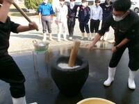 日本伝統行事『餅つき』を実施しました。近年は、餅をつく家庭も少なくなりました。餅をついたとしても、餅つき用の機械を使用し、『杵(きね)』と『臼(うす)』で餅をつく家庭を見る機会は少なくなってしまいました。本校では、日本文化を学ぶことも目的とし、取り組んでいます。餅米は、農業科で栽培したものを使用しています。生徒たちは楽しく餅つきをしていました。ついた餅は、美味しくいただきました。