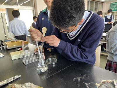 食品化学科の2年生は炭水化物の学習中です。この日は、フェーリング反応の実験をしました