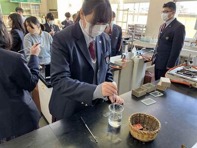 2年生の食品微生物で酵母を染色して観察する実験を行いました。