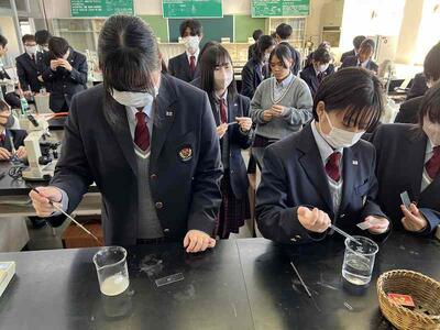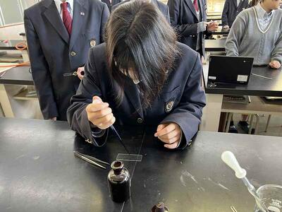 2年生の食品微生物で酵母を染色して観察する実験を行いました。