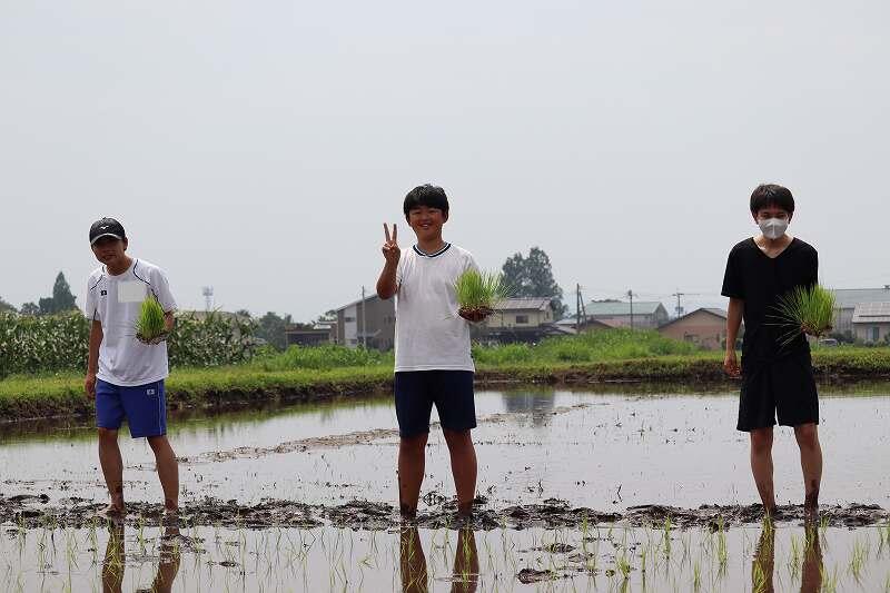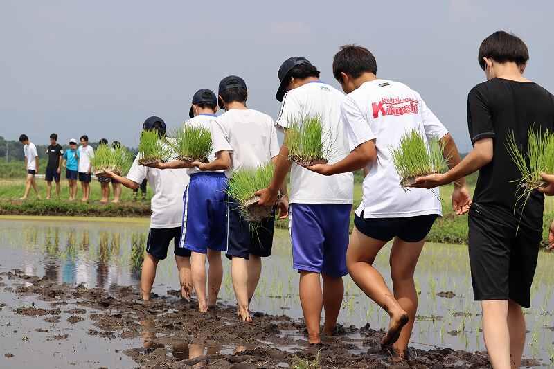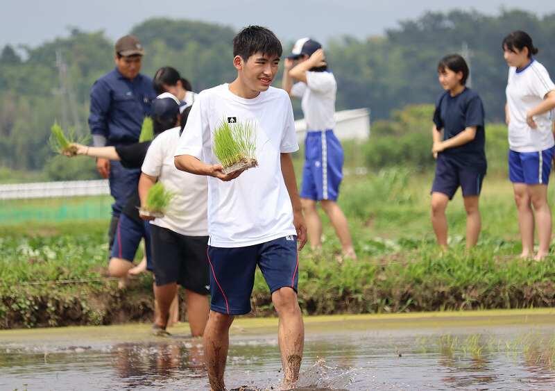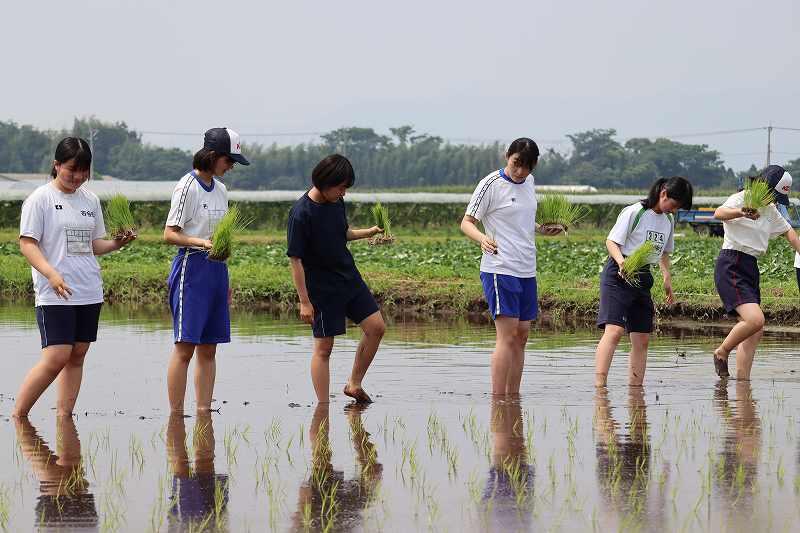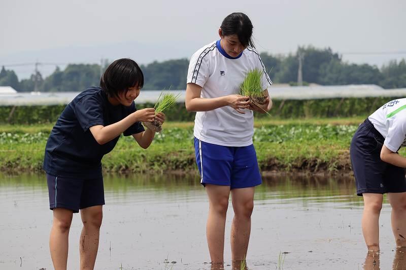 絶好の田植え日和の中、農業科の作物担当、荒木先生のご指導のもと