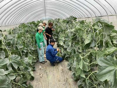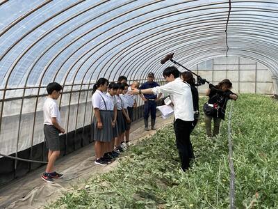 園芸科野菜部門のスイカ栽培ハウスを花房小学校生7人が訪れ、熱中症と温度・湿度・風の関係について体感する取材に協力しました。