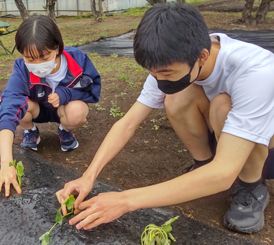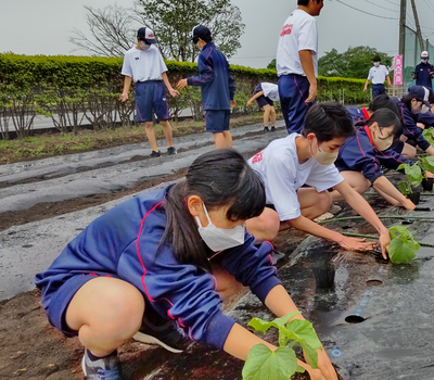 食品化学科1年生が「農業と環境」の授業で野菜苗(ナス・ピーマン・キュウリ・オクラ・サツマイモ)の定植を行いました。